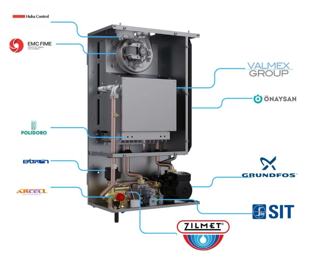 Модулируемая горелка автоматически регулируется в зависимости от потребности в тепле, обеспечивая экономию энергии и стабильную работу.